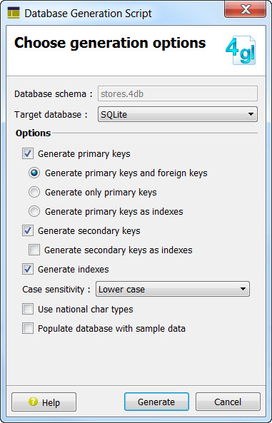• Generate Database Creation Script to generate a source 4gl file that can be used to create a new database and tables according to the meta-schema file.